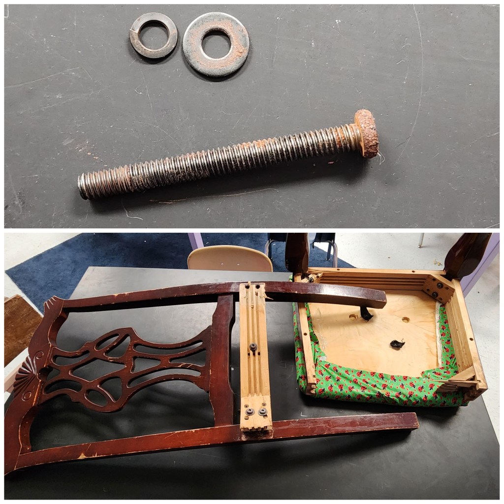 So just a quick story about my classroom before we get into the online dating situation. If you don’t know I do free choice seating in my classroom. I also do flex seating where I offer different types of chairs that the students can use. I have collected chairs from different places. I have a chair that someone rescued from the side of the road for me. He power washed it and I reupholstered it. Well let’s just say there was obviously a reason that this chair was on the curb. This screw fell out of it and this happened! Don’t worry the child sitting the chair said that she could hear and feel it going so when it did crash to the ground she was ready for it! So needless to say we are down a chair! Don’t worry no 6th graders were harmed! We quickly threw the chair away and moved on! haha