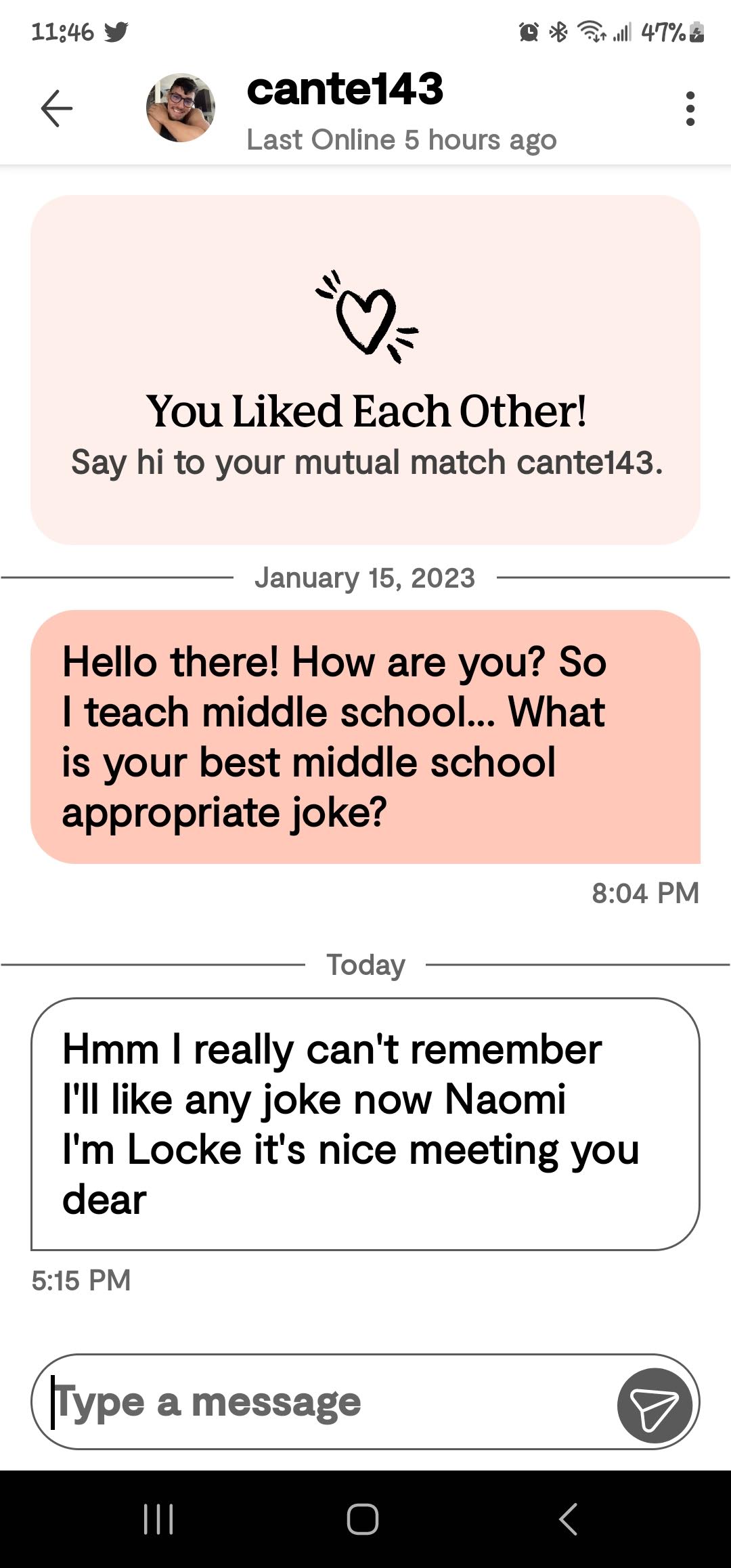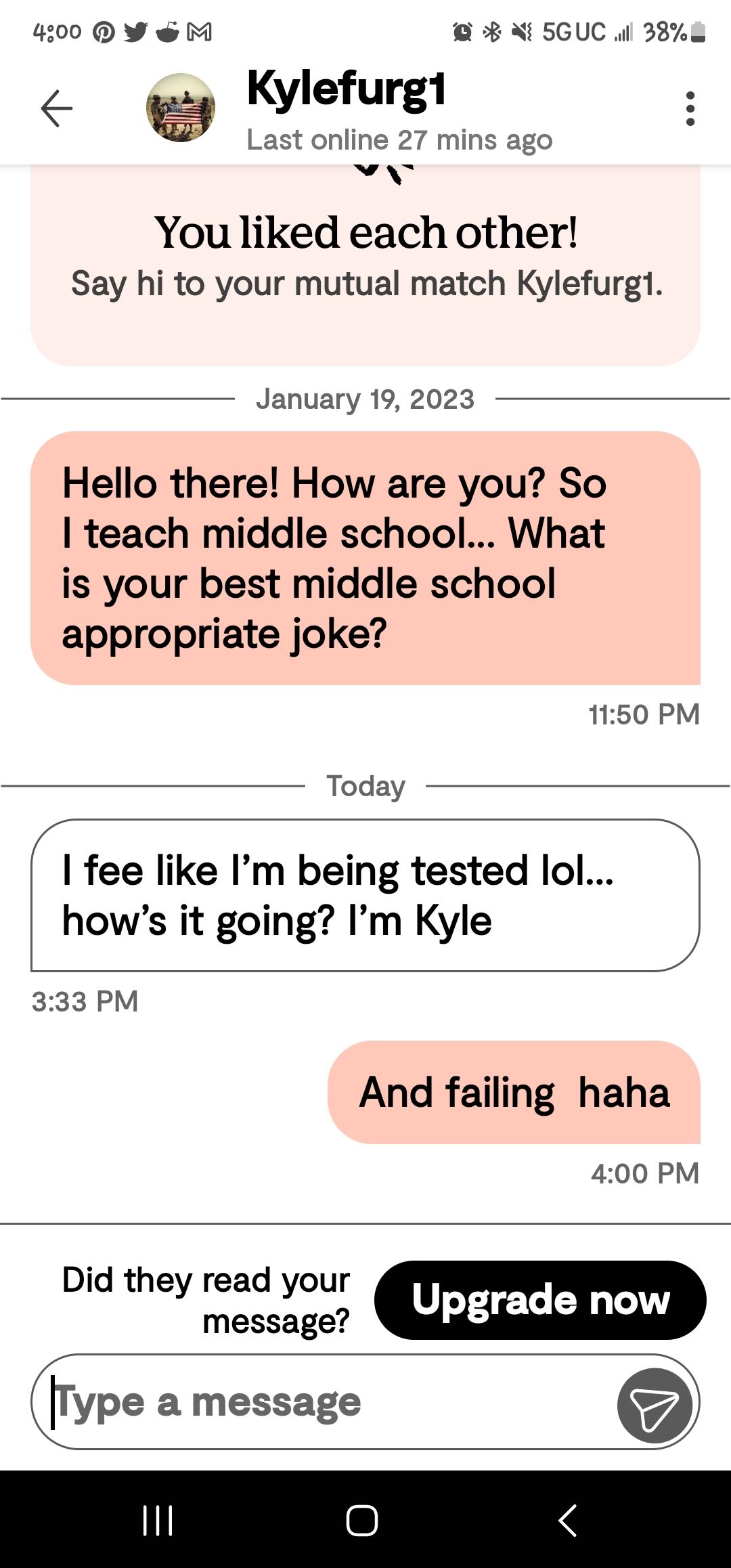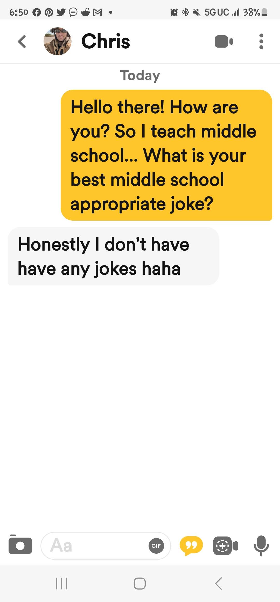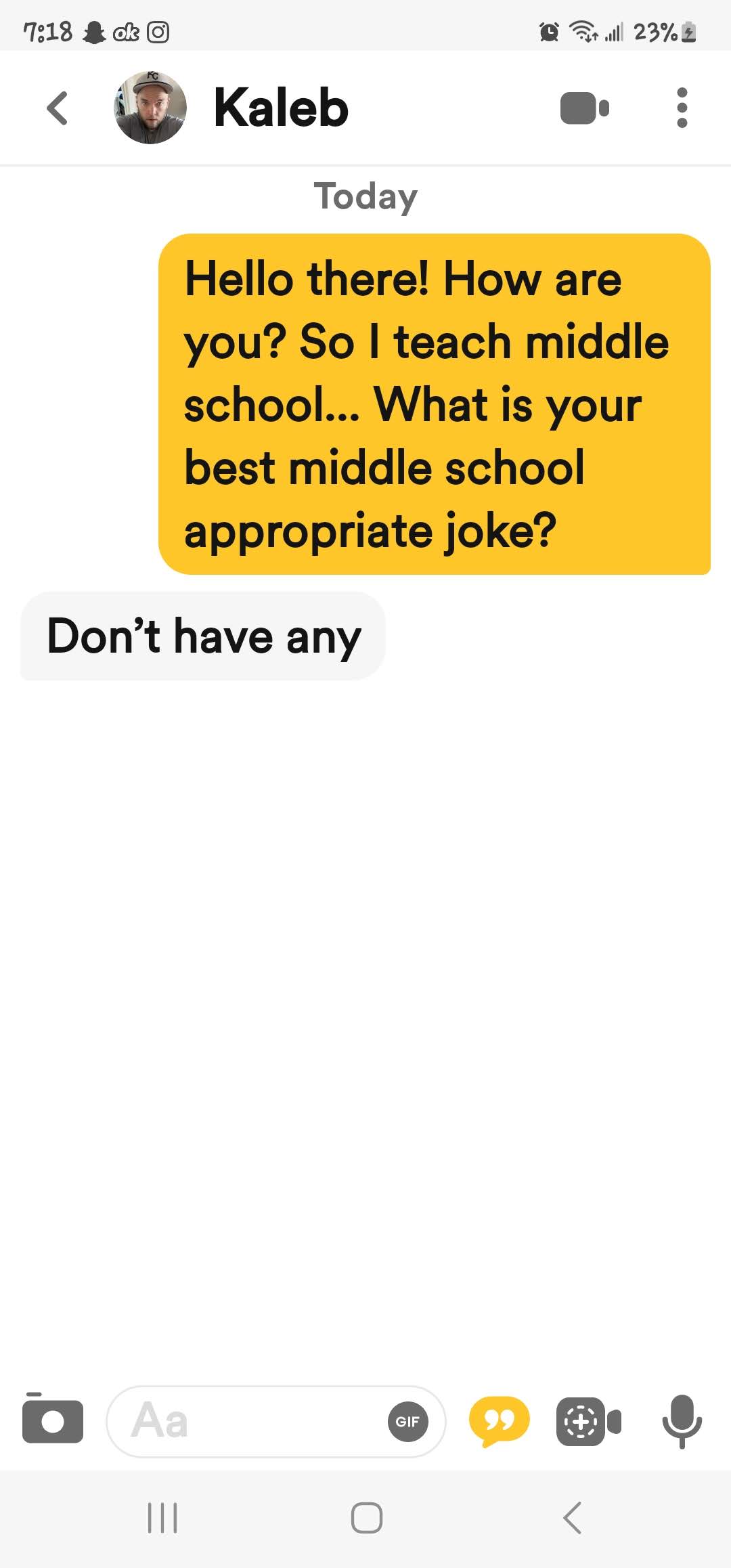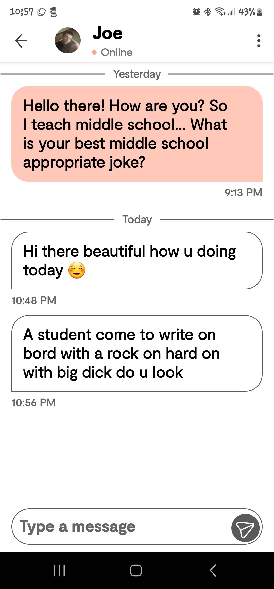Ok so on to the online dating. It is going… so well! (That was sarcasm in case you missed it!) I am trying a few different sites so it is not just the one. On Bumble their whole thing is that the women make the first move. So my conversation starter is that I teach middle school and for them to give me their best middle school appropriate joke. I am asking for some pretty minimal effort here. I mean if you don’t have one maybe google one? I mean come on… There are some of the responses I have received.