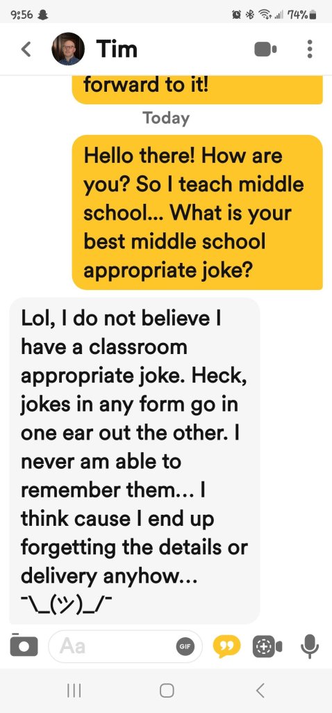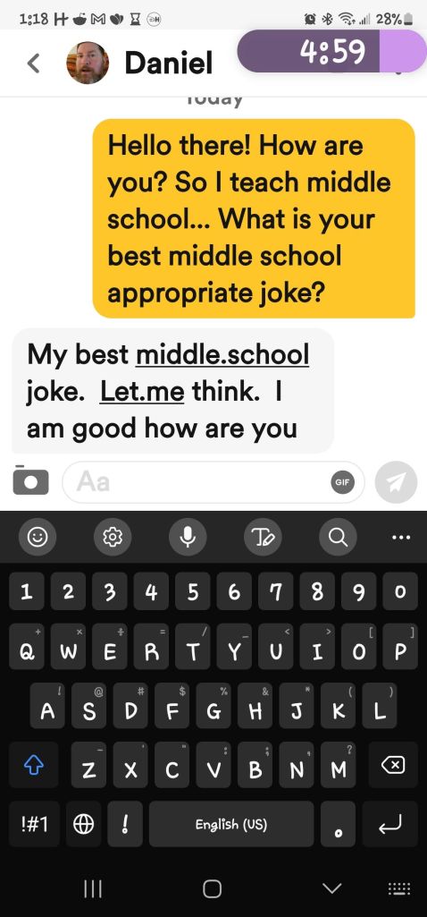 Here are a couple more online dating responses. I did have a guy that got past the tell me a joke part. We have been talking for a few days. I am a little concerned bout some of the “liberties” he took with his profile. Maybe I just misunderstood what he meant? We shall see the more we talk how things go. Is it bad that I don’t have high hopes. Maybe he will surprise me in the next week! Don’t worry I will keep y’all updated.