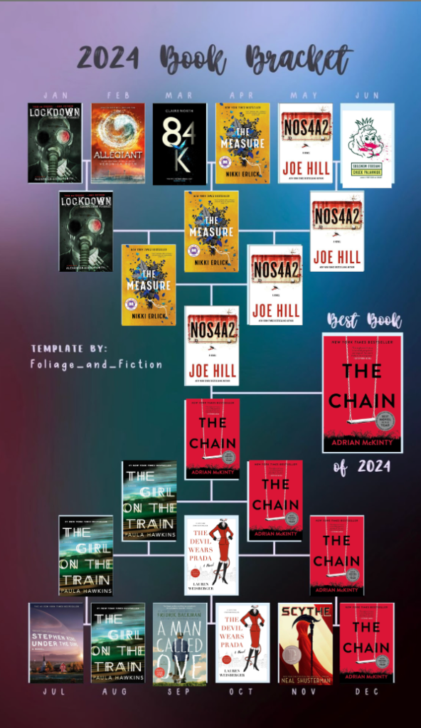 I have no problem talking to anyone about any book that you want to talk about! There were books that I loved, there were books that I tolerated and there was 1 book that I HATED! In that books defense I would have DNF’d that book if it had not been a book club book! This is for sure the most books I have read in a long time! I have a few rules that I wan’t to implement for my reading in 2024. This year I read 74 books. My goal for next year is 75. I tend to DNF books that I just can’t get in to. I know that this is ok because there are no rules. However, I really should finish more of those books at rate them 1 star. I don’t know we shall see how that works! haha In case you didn’t notice I tend to go to the dystopian, scifi kinda dark books so if you have any suggestions please let me know. This year I discovered Joe Hill and have really enjoyed him. My goal this year is to read more than 2 non-fiction books! Here is my 2024 book bracket so if you are in my book club pretend you didn’t see this till Saturday!
