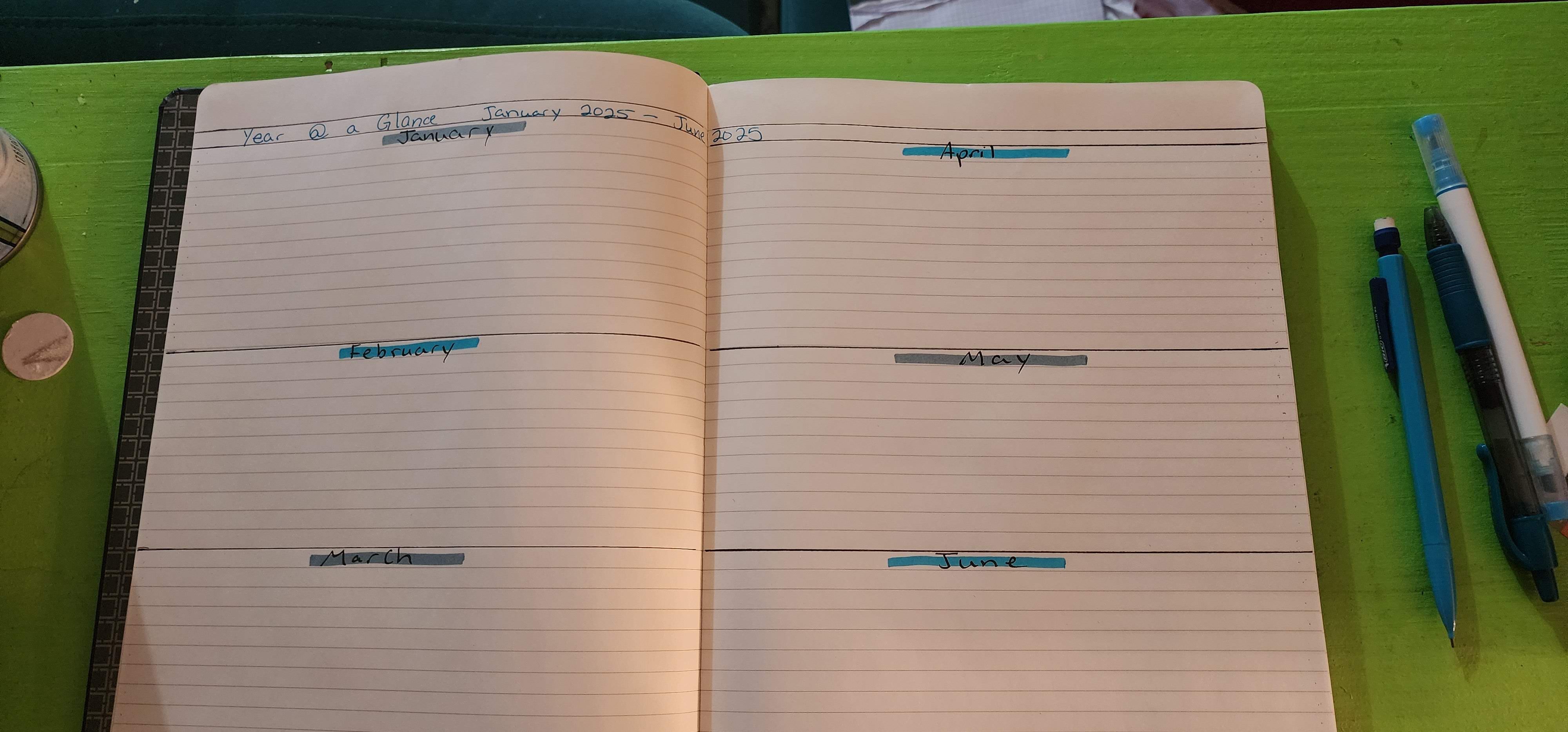 I usually start a brand new journal at the beginning of a year, the beginning of a school year or when I need a fresh start. Again do what is best for you! haha whenever I am starting I start with a glance at the next 6 months. I divide both pages in to three. Put the next 6 months down and then fill in important things. I don’t put holidays but you can if you want to. I usually put things like trips I’m taking, deadlines that need to be met, appointments that are already set, and just important dates to remember like weddings and parties. These would be things that are scheduled months in advance. When I get my syllabus I go through and fill in all the important dates of when things are due and when we aren’t having class. This is what that looks like