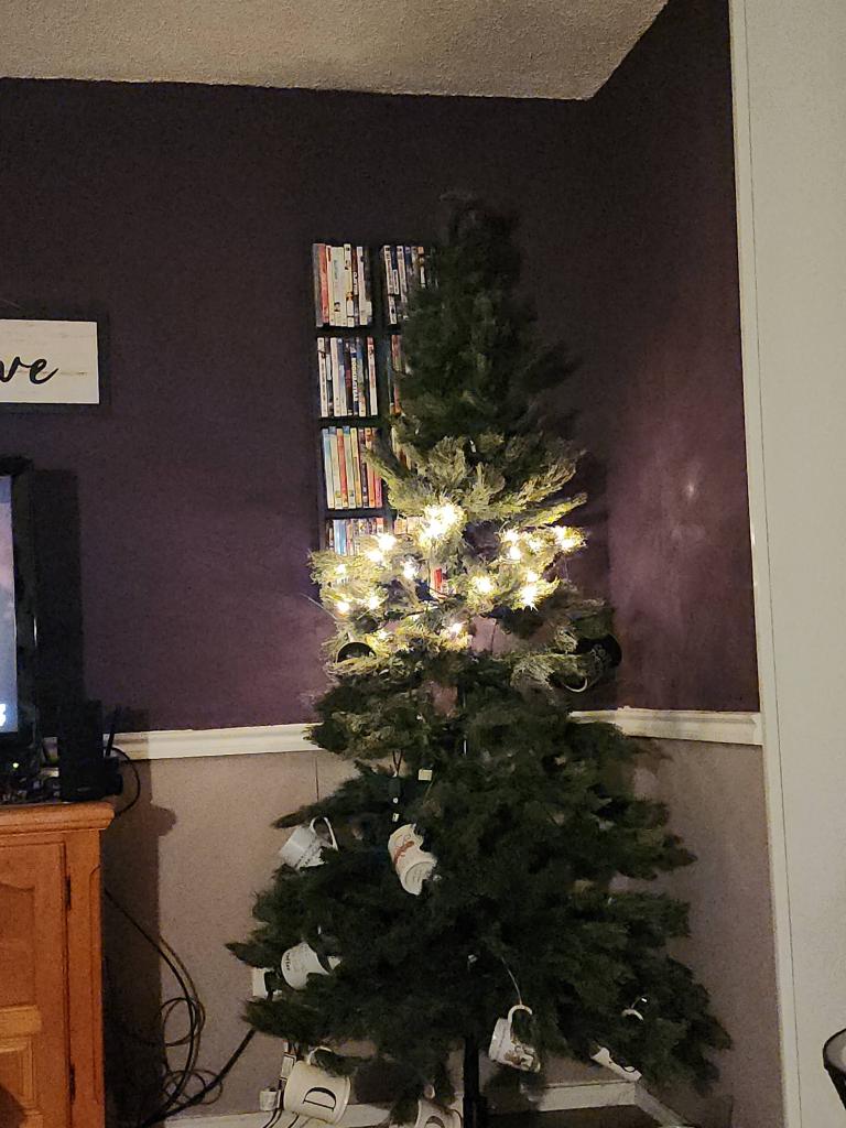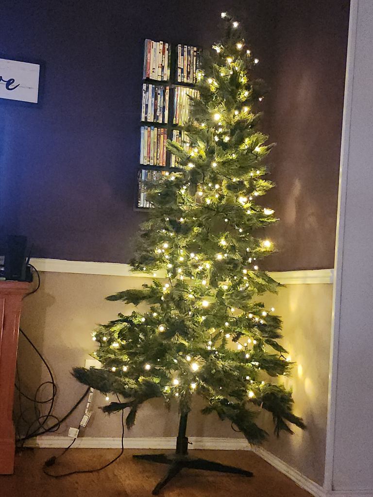 I am not sure if you all know that I keep my “Christmas” tree up all year. I decorate it for the different seasons or holidays. I also like the ambiance that the lights give the room. My living room is really dark so it adds a little extra light. Well, it has been up and used full time like this for about 3 years so in the past couple months the lights have started to go out! Well last weekend I was down to just one strand! My mom said that it looked like my tree was wearing a hoola-hoop. So I ordered new lights and I relit my tree last night! Now I just have to decide what I am going to use to decorate. Maybe Valentines day!