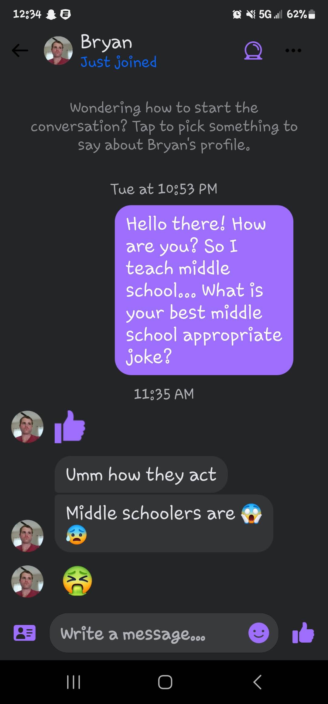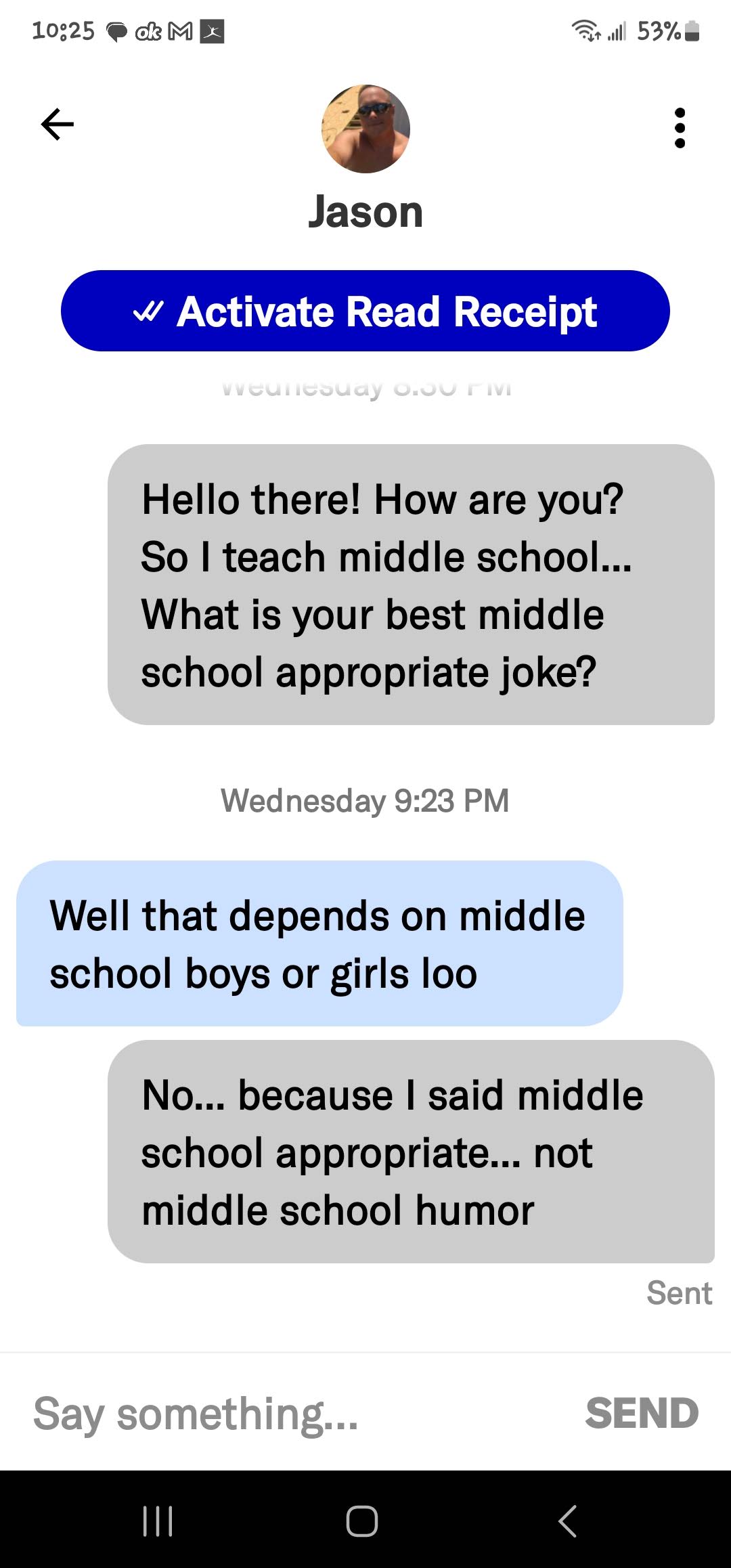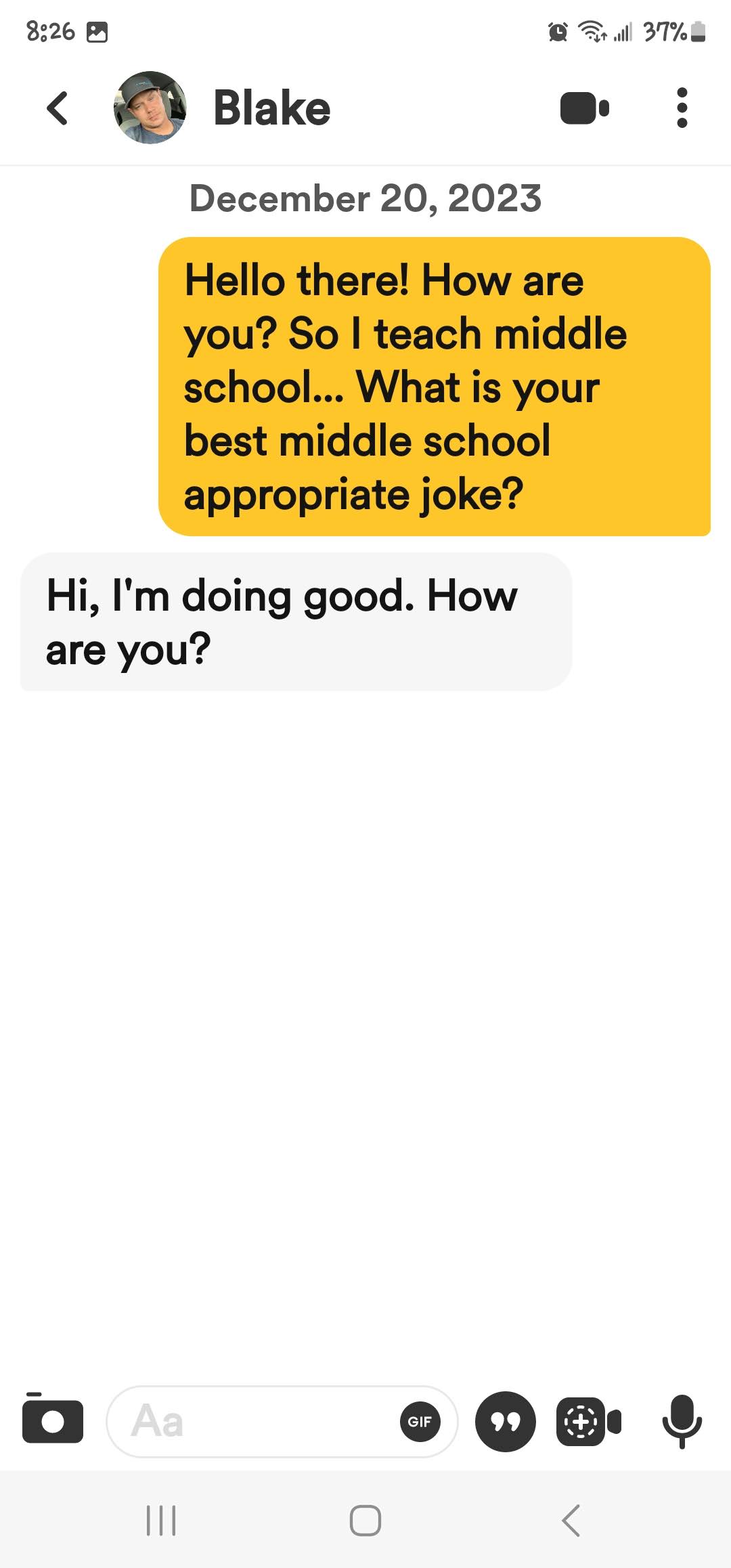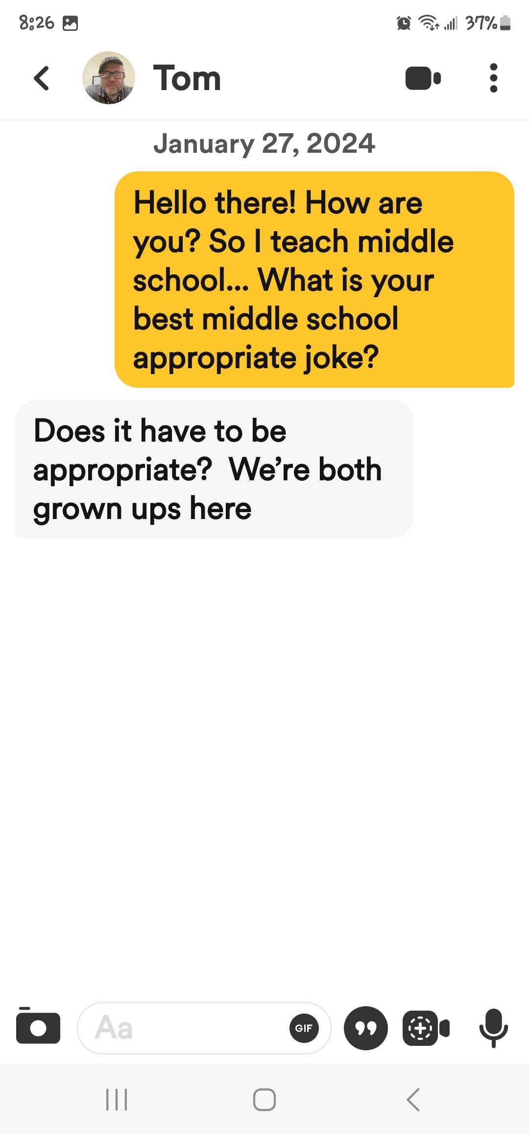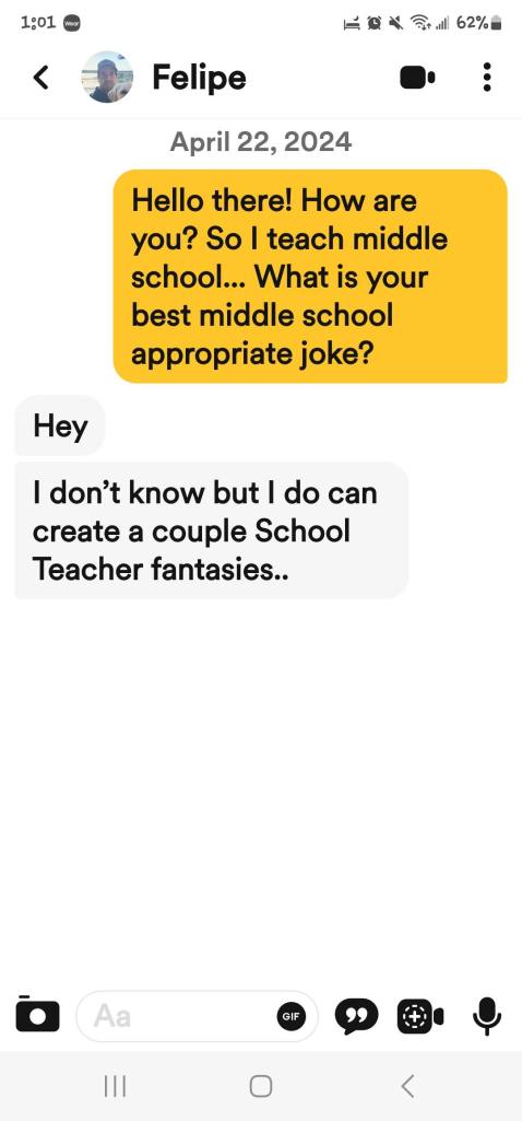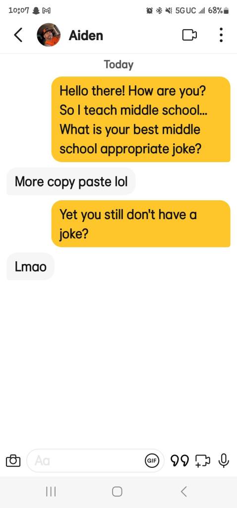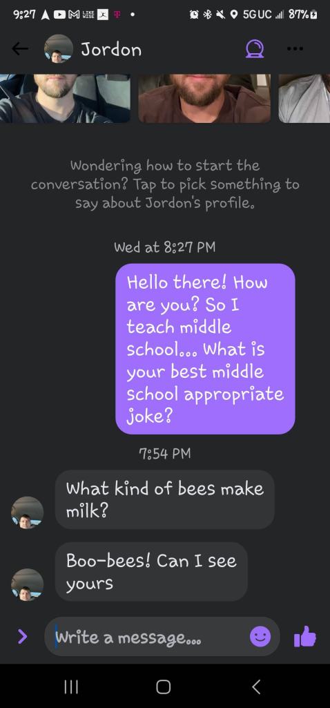 If you are new here, I ask all matches to give me a middle school appropriate joke. The answers I get range from ignoring the question entirely to giving me a not middle school appropriate joke and everything in between. These are the guys that either blow right past the question, refuse to google a joke or just start a different conversation! Or they act like my question is such a burden!
