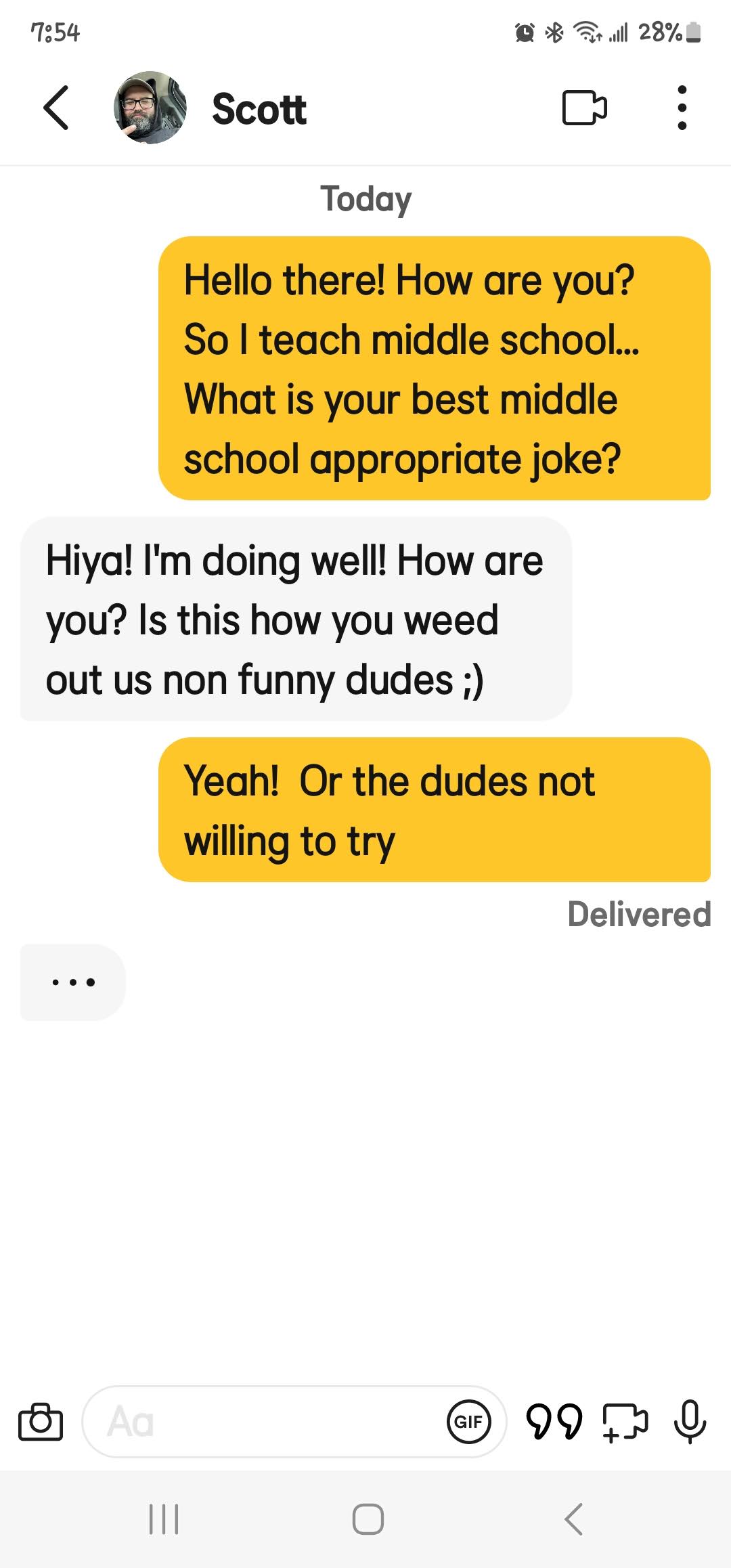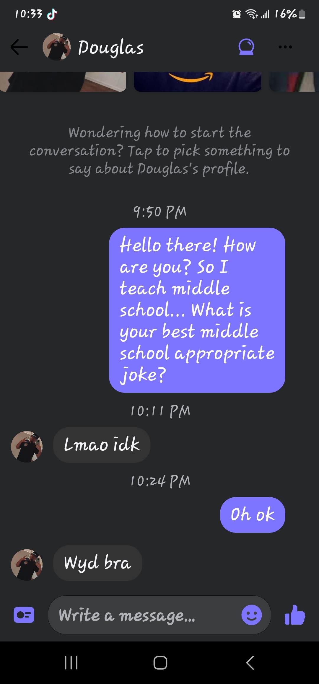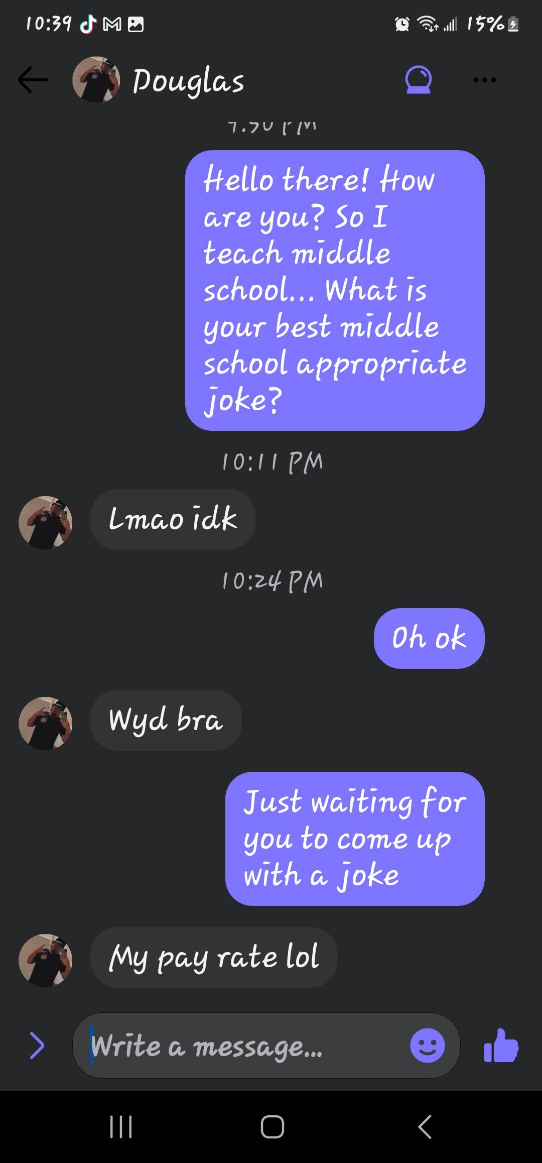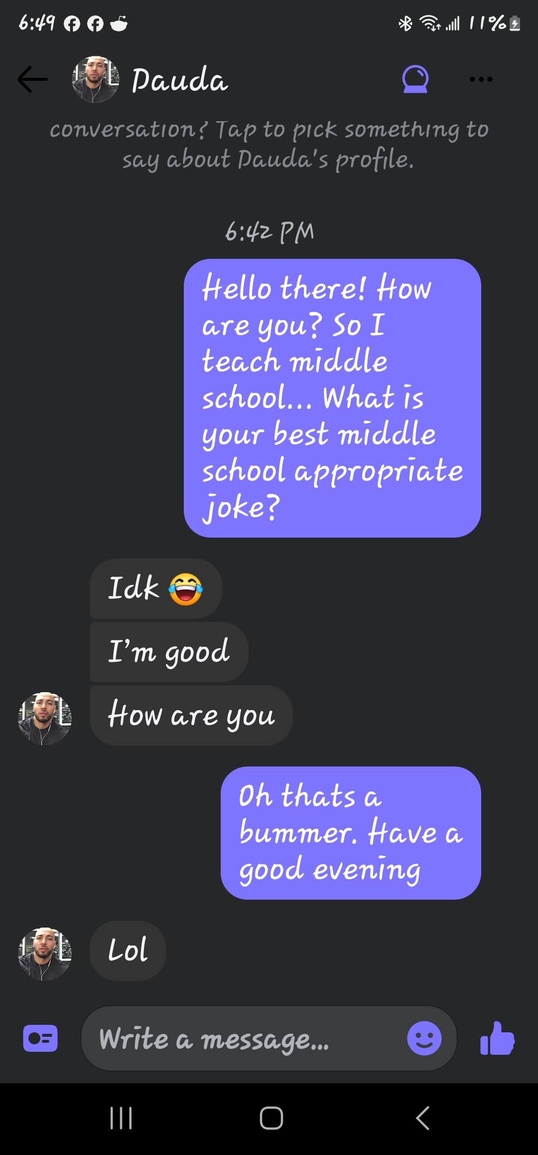 If you are new here, I ask all matches to give me a middle school appropriate joke. The answers I get range from ignoring the question entirely to giving me a not middle school appropriate joke and everything in between. These are the guys that either blow right past the question, refuse to google a joke or just start a different conversation! Or they act like my question is such a burden!