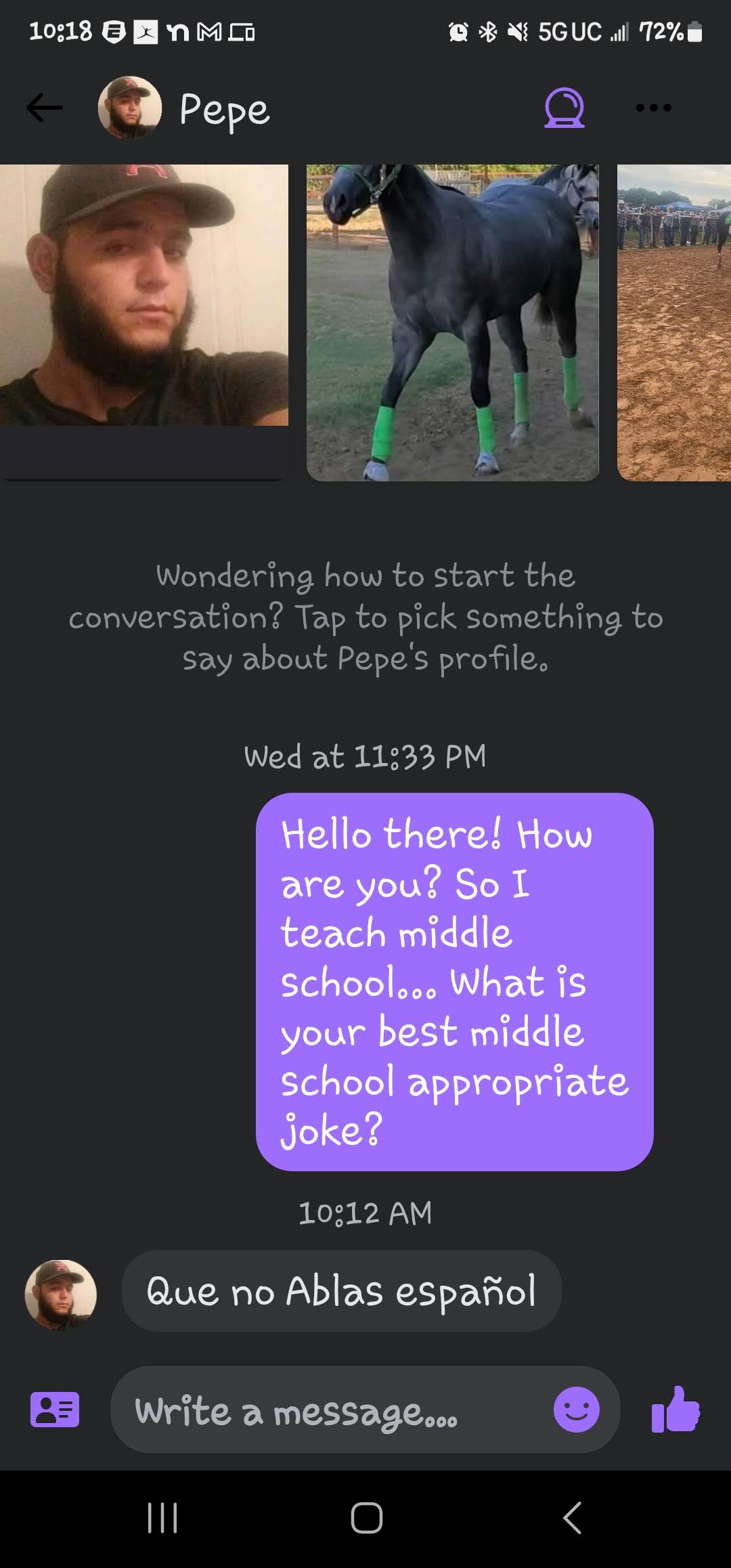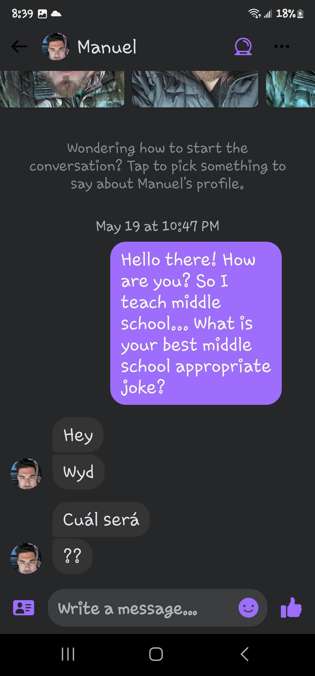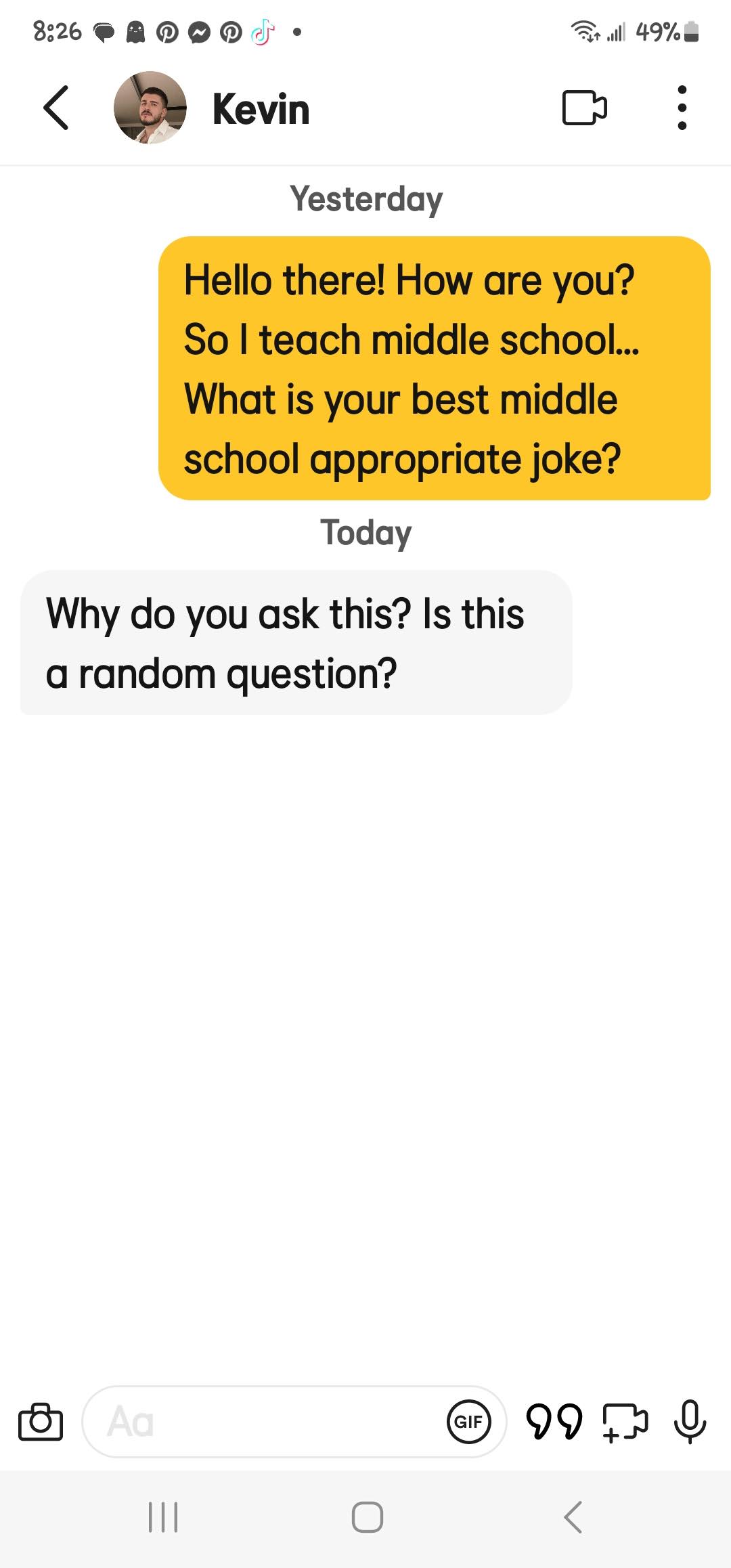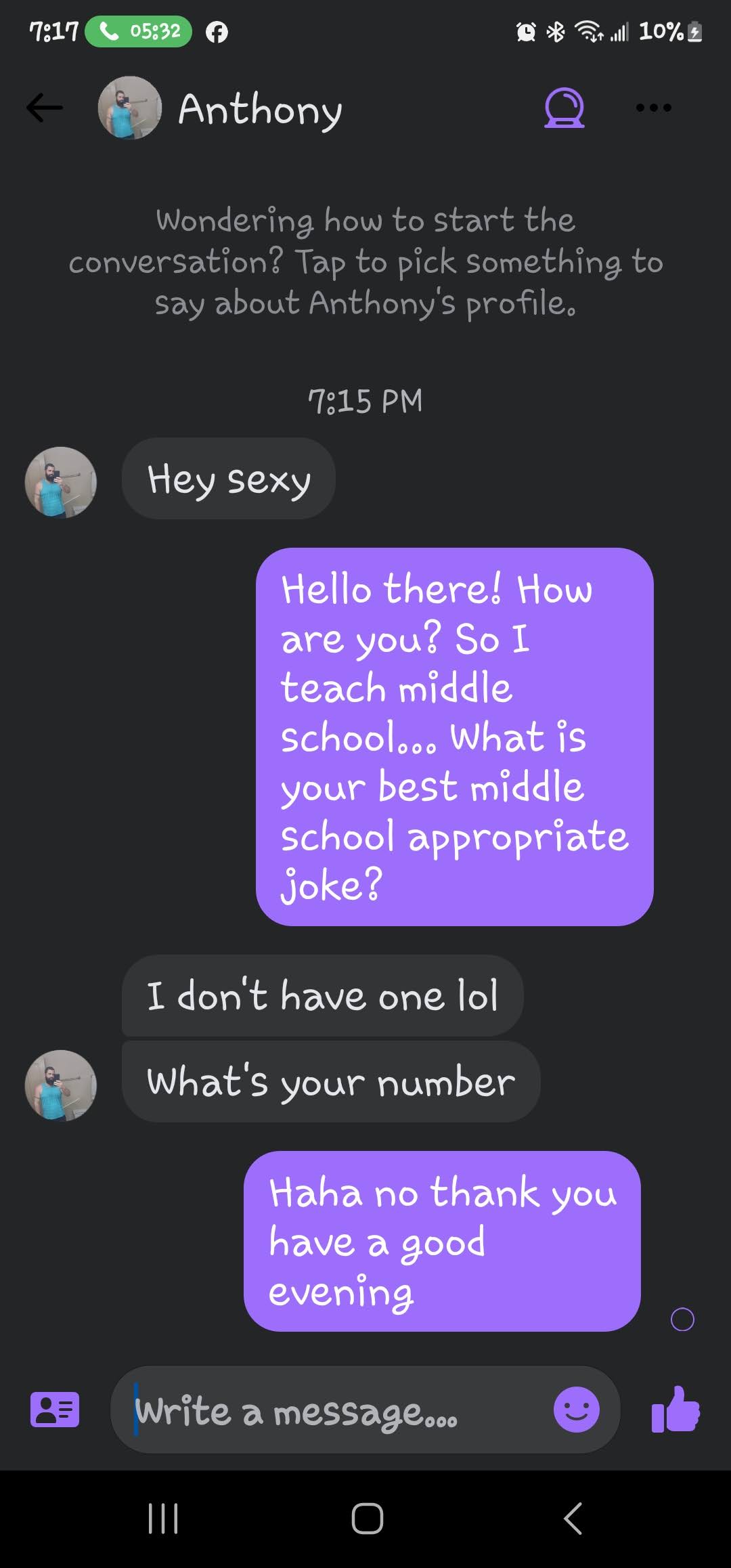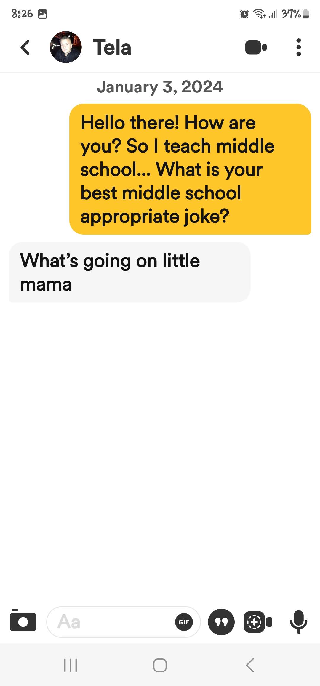 If you are new here, I ask all matches to give me a middle school appropriate joke. The answers I get range from ignoring the question entirely to giving me a not middle school appropriate joke and everything in between. These are the guys that either blow right past the question, refuse to google a joke or just start a different conversation! Or they act like my question is such a burden!