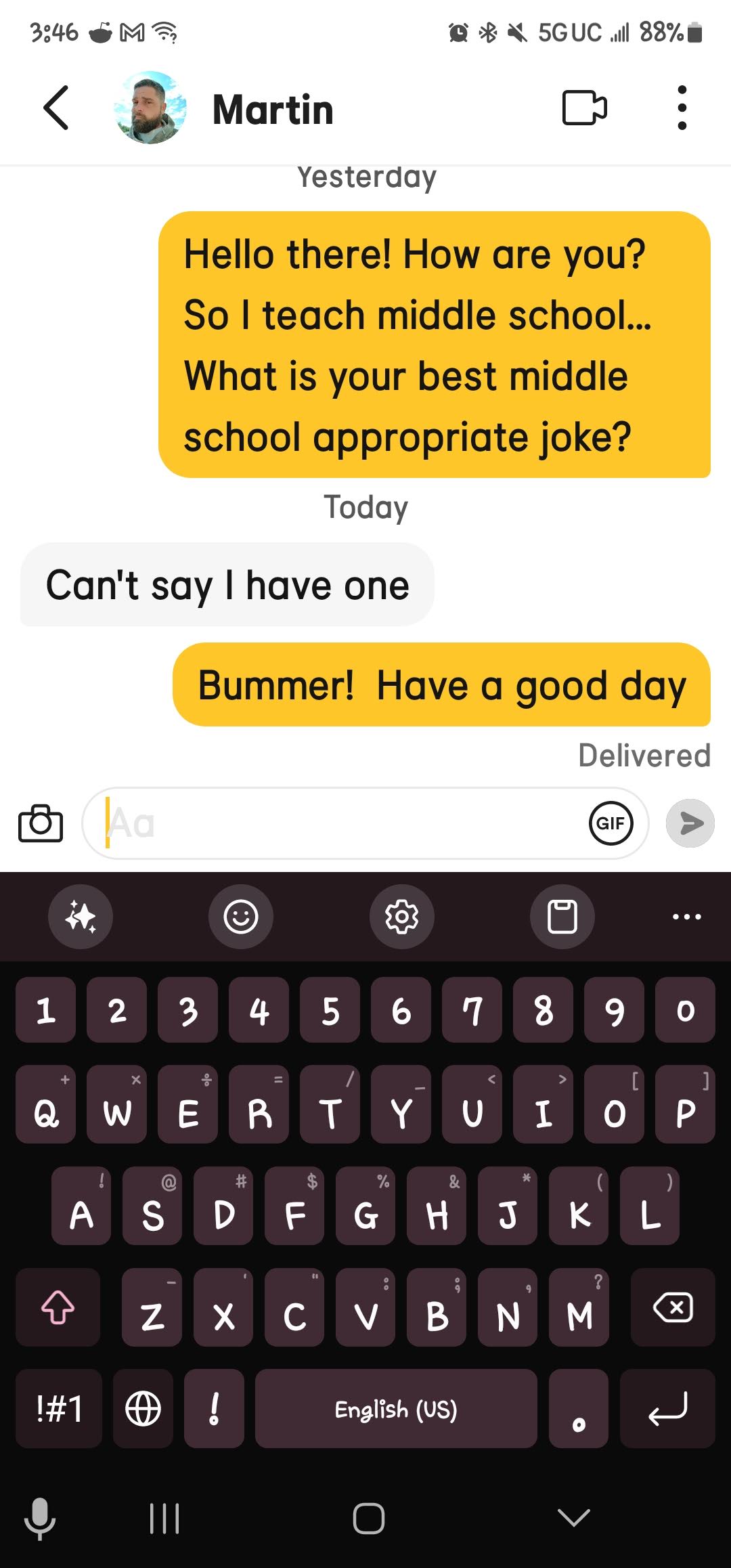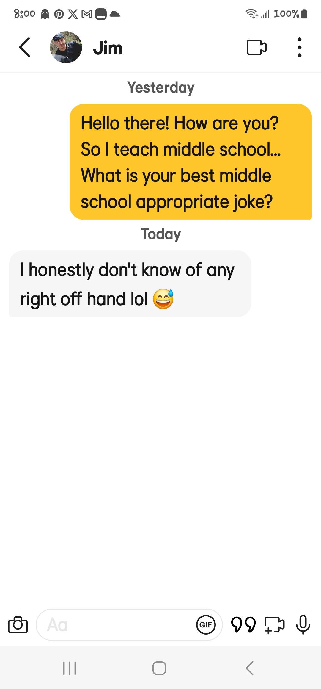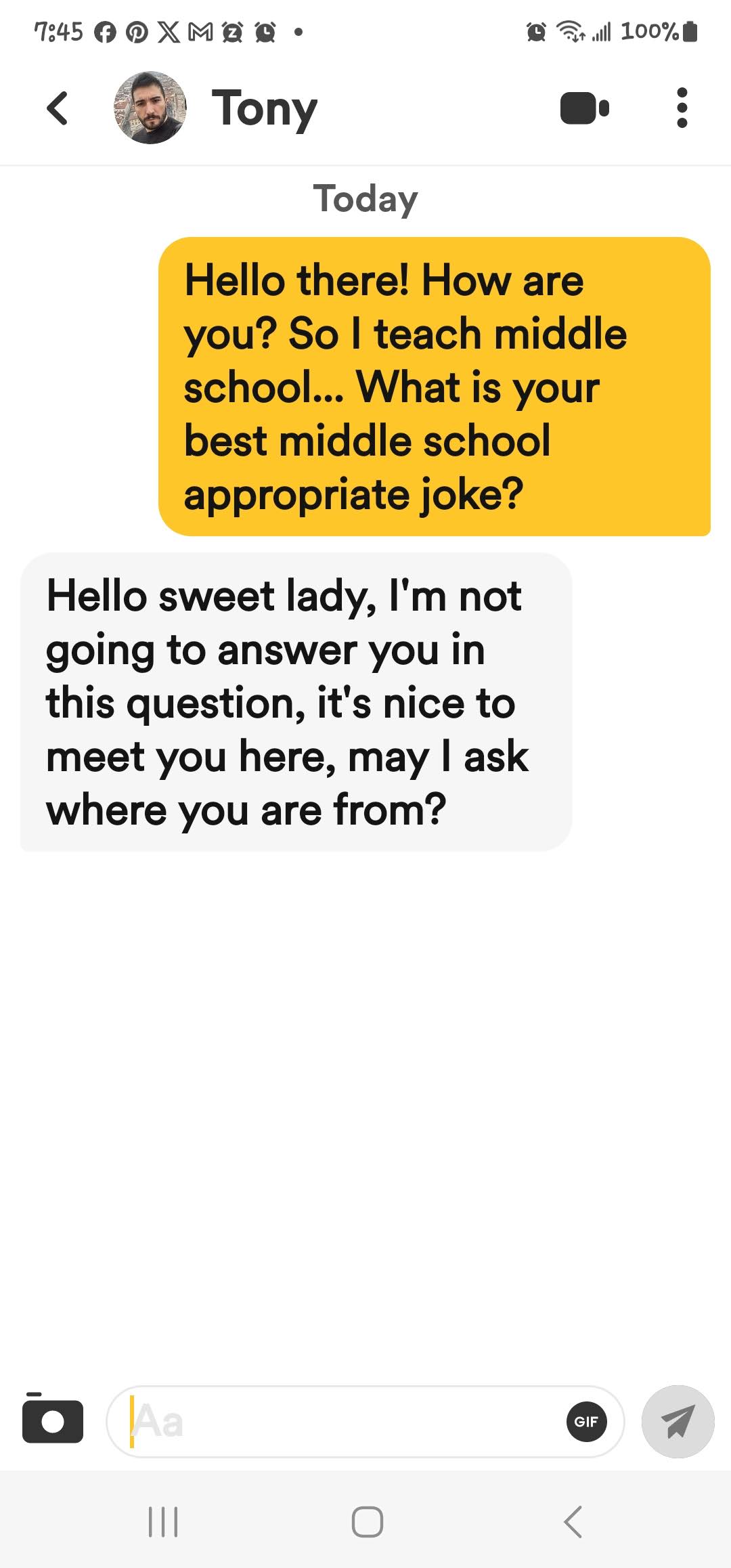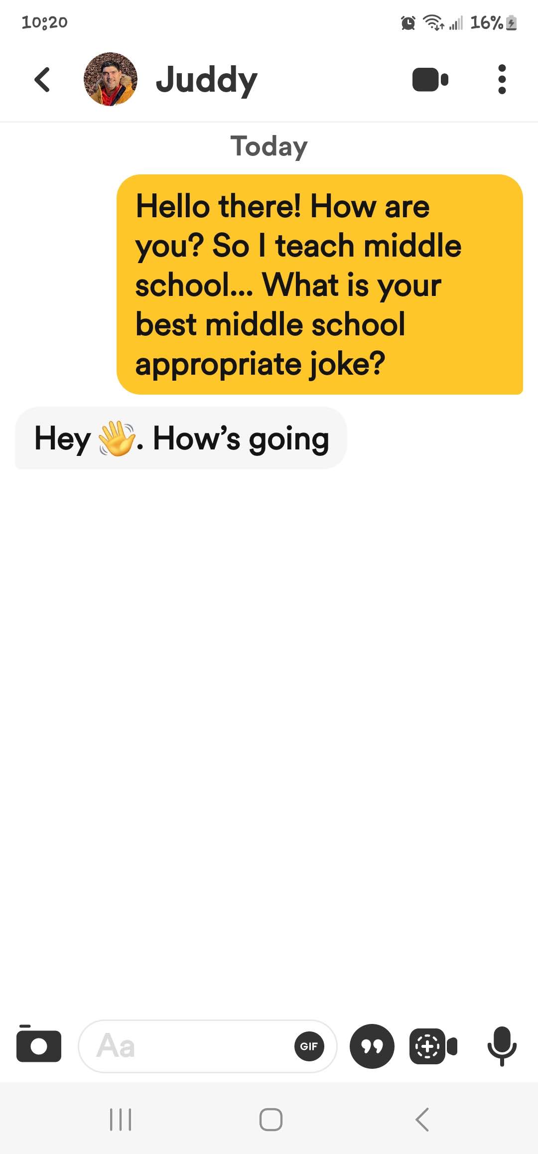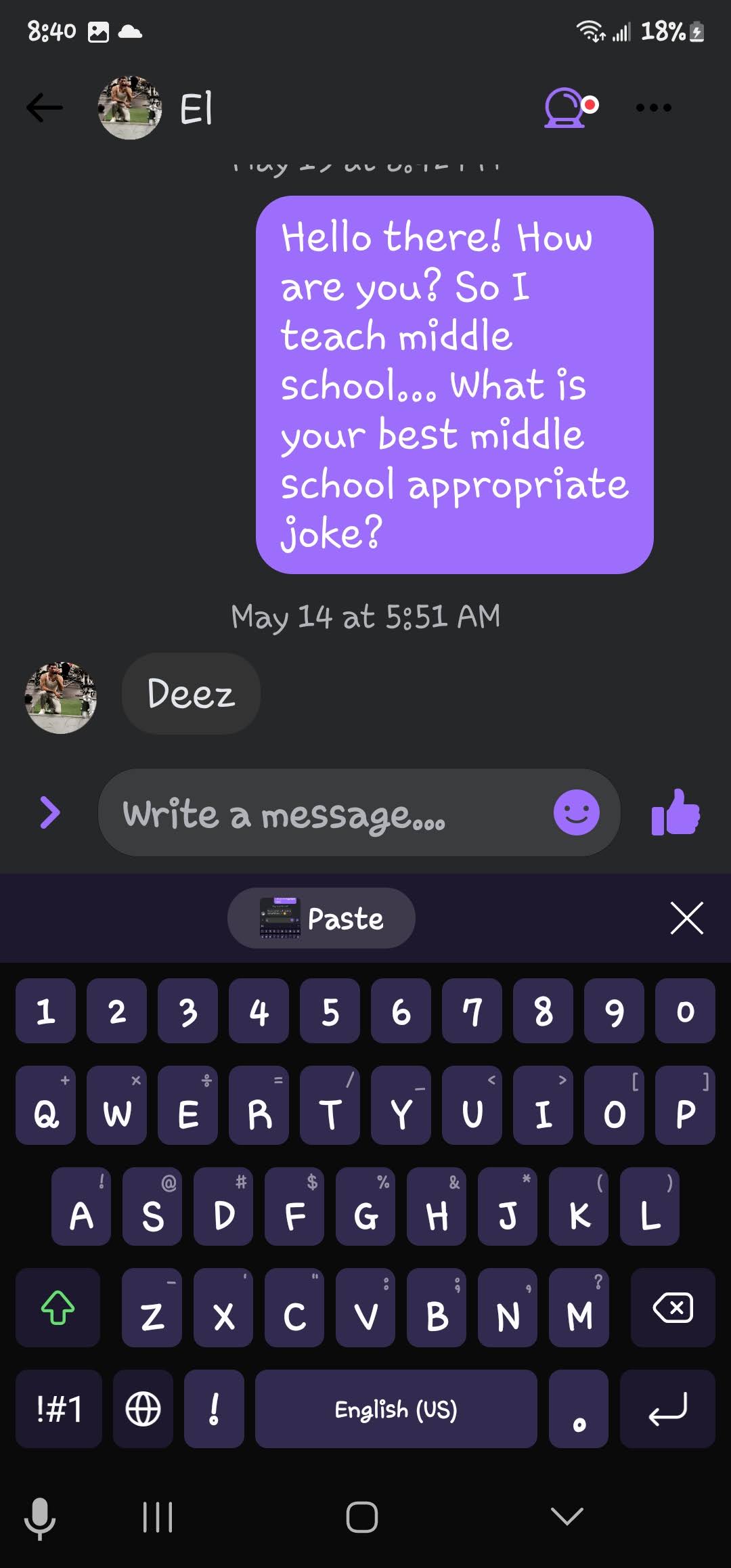If you are new here, I ask all matches to give me a middle school appropriate joke. The answers I get range from ignoring the question entirely to giving me a not middle school appropriate joke and everything in between. These are the guys that either blow right past the question, refuse to google a joke or just start a different conversation! Or they act like my question is such a burden!