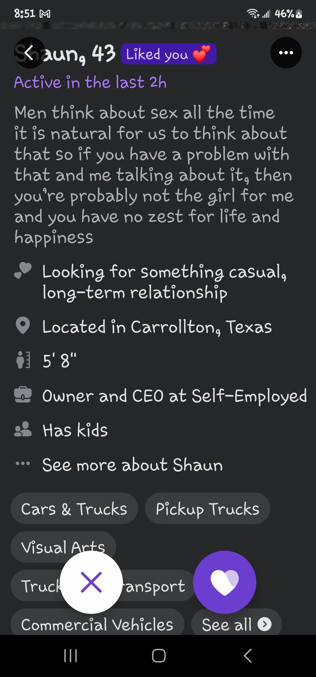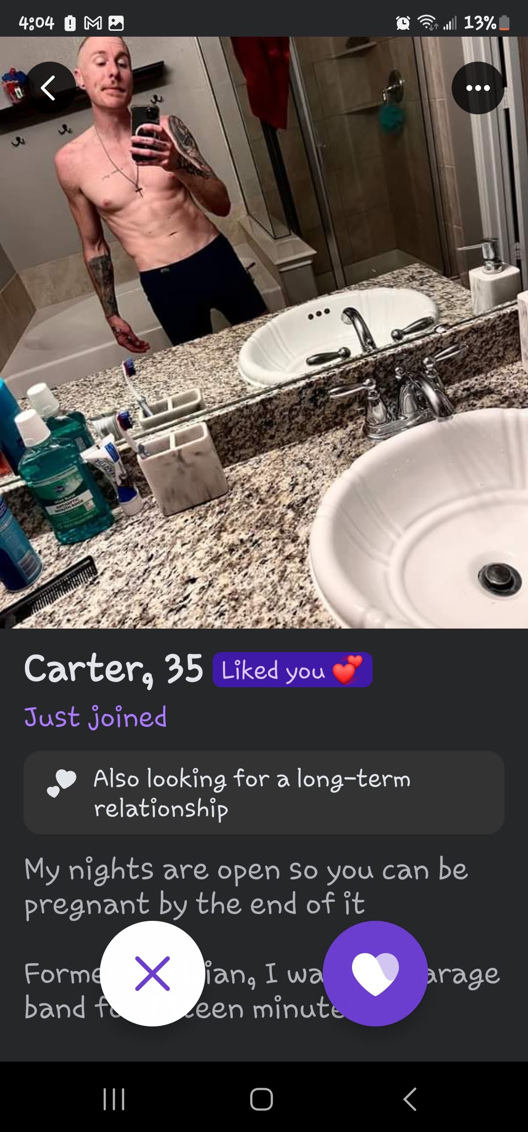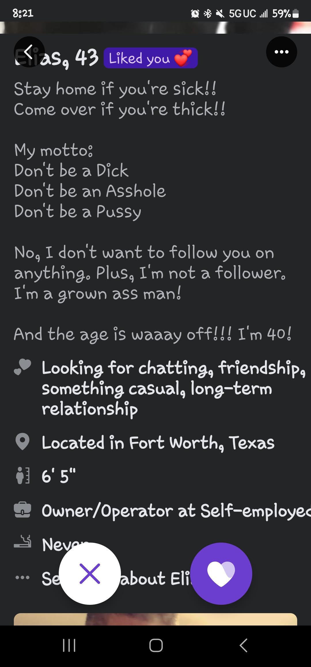 Ok these next few pictures are screen grabs of profiles. The first two are the same guy, I am just intrigued if these guys would be as bold in real life. Like do you go up to someone at the bar and say “My nights are open so you can be pregnant by the end of it.”? The guy that says his age is WAY off… I wonder how old that is because it said he was 40 at that time… and the age on the profile says 43… So how old is he!? And Rami, Oh man… Isn’t that the dream to marry rich!?!? haha Shaun, I understand what you are saying, however, I also need a man that can have a conversation about normal things too!