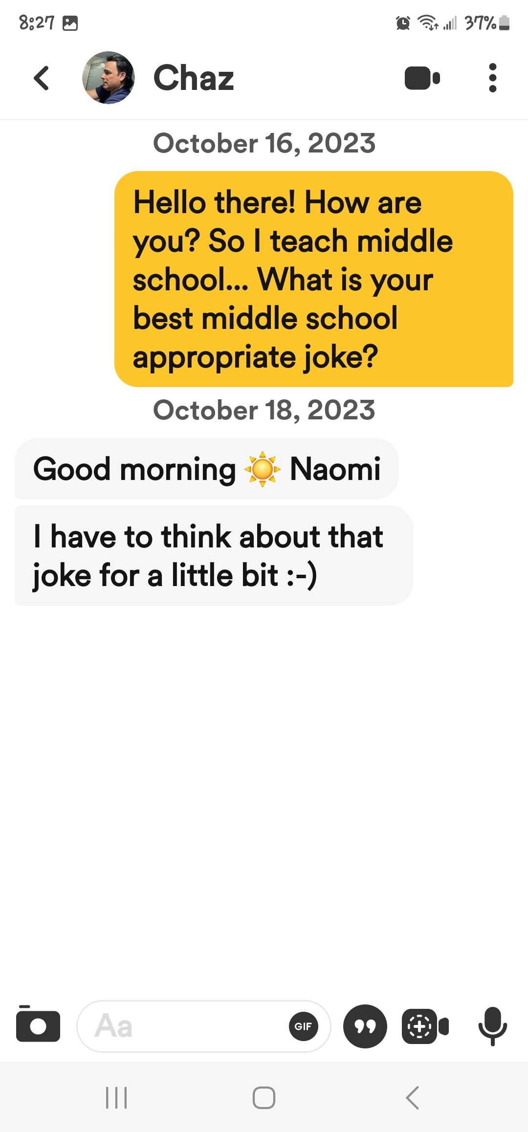 Apparently, I matched with Aiden before and he didn’t have a joke last time either!
