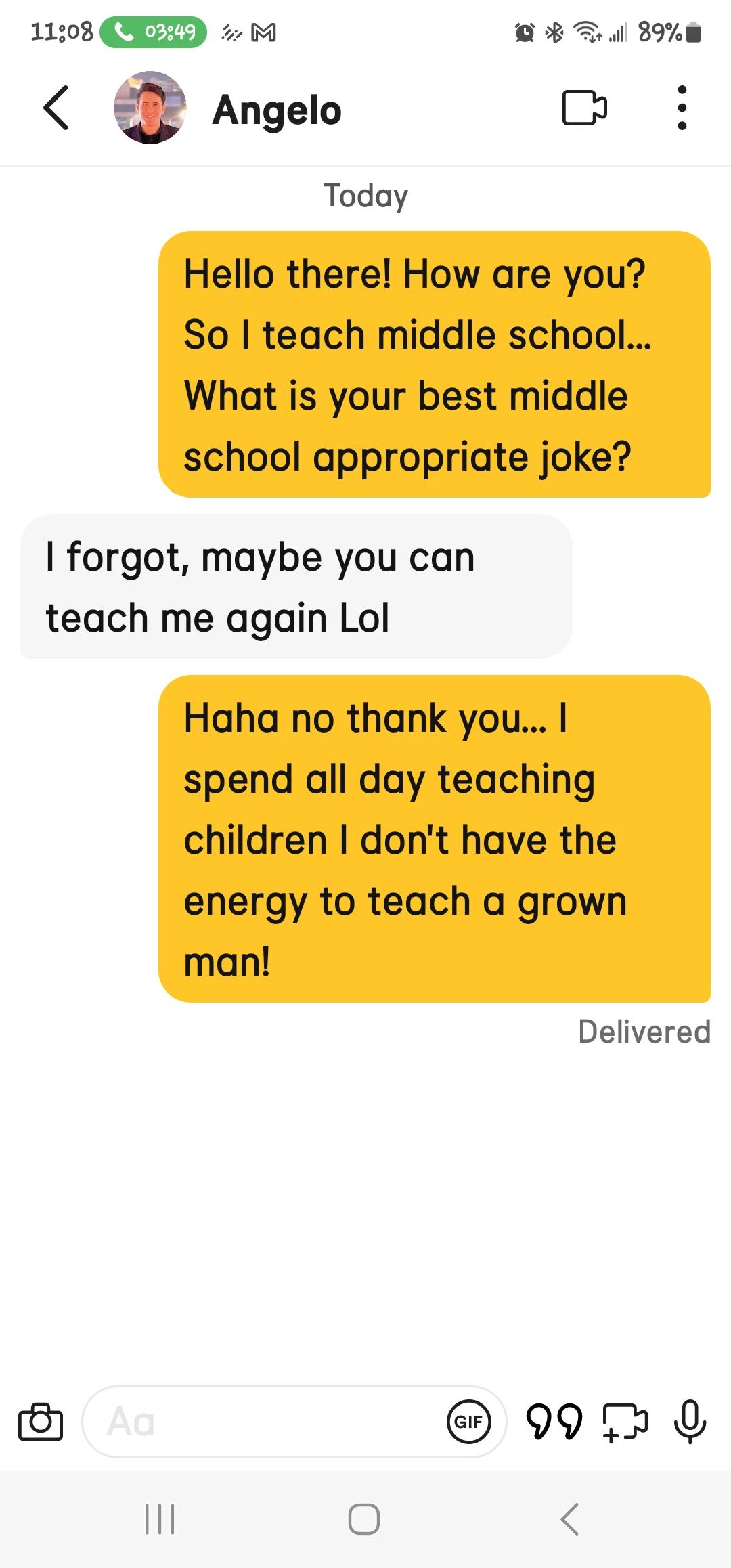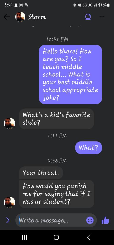 Then there was Storm that told me a “joke” essentially about swallowing semen then asked how I would “punish him” if he told that in my class. Again, talking to me like if he was in my class, What is the appeal!? But if you must know, if he was a student in my class telling that joke, I would have had him calls his mom and tell her the joke. Then he could explain to her why it was funny.